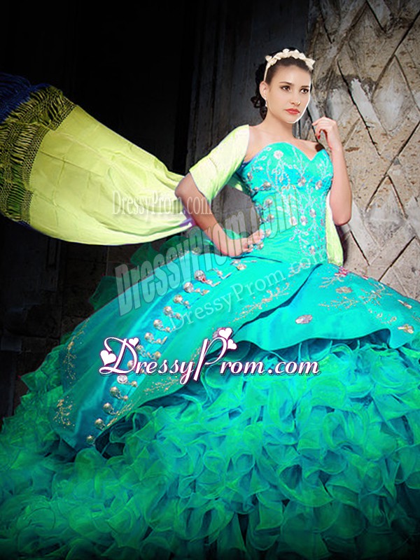 Neckline : SweetheartShown Color : TurquoiseSilhouette : Ball GownsSleeve Length : sleevelessHemline : with trainBack Detail : Lace upFabric : OrganzaEmbellishment : Embroidery,RufflesOccasion : Military Ball,Sweet 16,QuinceaneraSeason : Spring,Summer,Fall,Winter