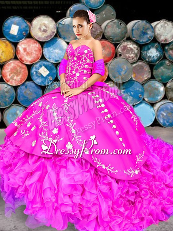 Neckline : SweetheartShown Color : FuchsiaSilhouette : Ball GownsSleeve Length : sleevelessBack Detail : Lace upFabric : OrganzaEmbellishment : Embroidery,RufflesOccasion : Military Ball,Sweet 16,QuinceaneraSeason : Spring,Summer,Fall,Winter