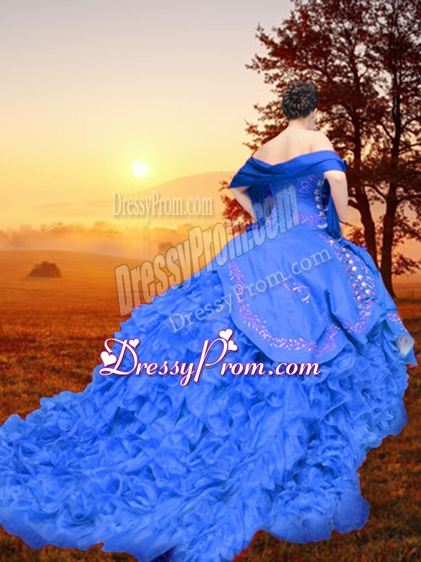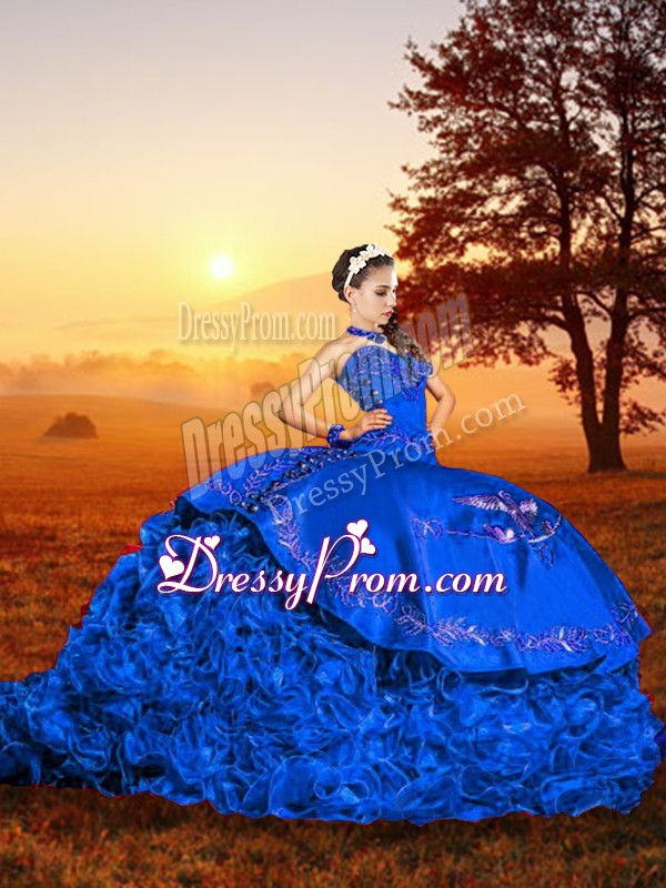 Neckline : SweetheartShown Color : BlueSilhouette : Ball GownsSleeve Length : sleevelessBack Detail : Lace upFabric : OrganzaEmbellishment : Embroidery,RufflesOccasion : Military Ball,Sweet 16,QuinceaneraSeason : Spring,Summer,Fall,Winter