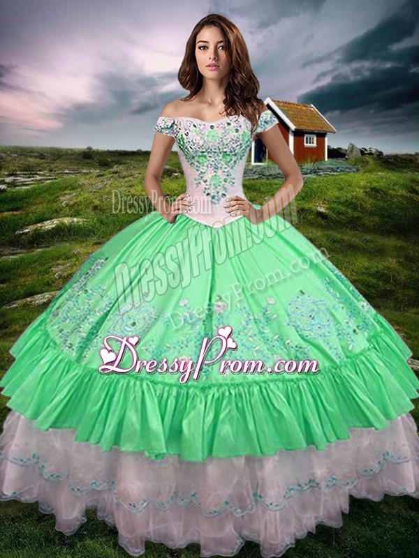 Neckline : Off the shoulderShown Color : GreenSilhouette : Ball GownsSleeve Length : sleevelessHemline : floor lengthBack Detail : Lace upFabric : TaffetaEmbellishment : Beading,Embroidery,Ruffled LayersOccasion : Military Ball,Sweet 16,QuinceaneraSeason : Spring,Summer,Fall,Winter