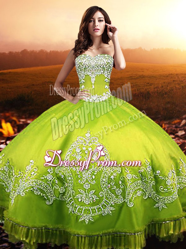 Neckline : SweetheartShown Color : Yellow GreenSilhouette : Ball GownsSleeve Length : sleevelessHemline : floor lengthBack Detail : Lace upFabric : TaffetaEmbellishment : Beading,AppliquesOccasion : Military Ball,Sweet 16,QuinceaneraSeason : Spring,Summer,Fall,Winter