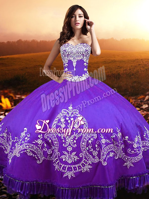Neckline : SweetheartShown Color : PurpleSilhouette : Ball GownsSleeve Length : sleevelessHemline : floor lengthBack Detail : Lace upFabric : TaffetaEmbellishment : Beading,AppliquesOccasion : Military Ball,Sweet 16,QuinceaneraSeason : Spring,Summer,Fall,Winter