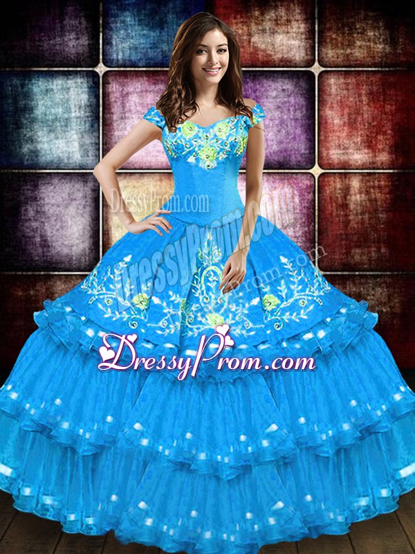 Neckline : Off the shoulderShown Color : Baby BlueSilhouette : Ball GownsSleeve Length : sleevelessHemline : floor lengthBack Detail : Lace upFabric : TaffetaEmbellishment : Embroidery,Ruffled LayersOccasion : Military Ball,Sweet 16,QuinceaneraSeason : Spring,Summer,Fall,Winter