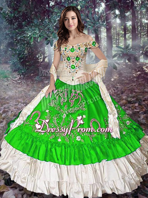 Neckline : Off the shoulder Shown Color : Spring Green Silhouette : Ball Gowns Sleeve Length : sleeveless Hemline : floor length Back Detail : Lace up Fabric : Taffeta Embellishment : Embroidery,Ruffled Layers Occasion : Military Ball,Sweet 16,Quinceanera Season : Spring,Summer,Fall,Winter