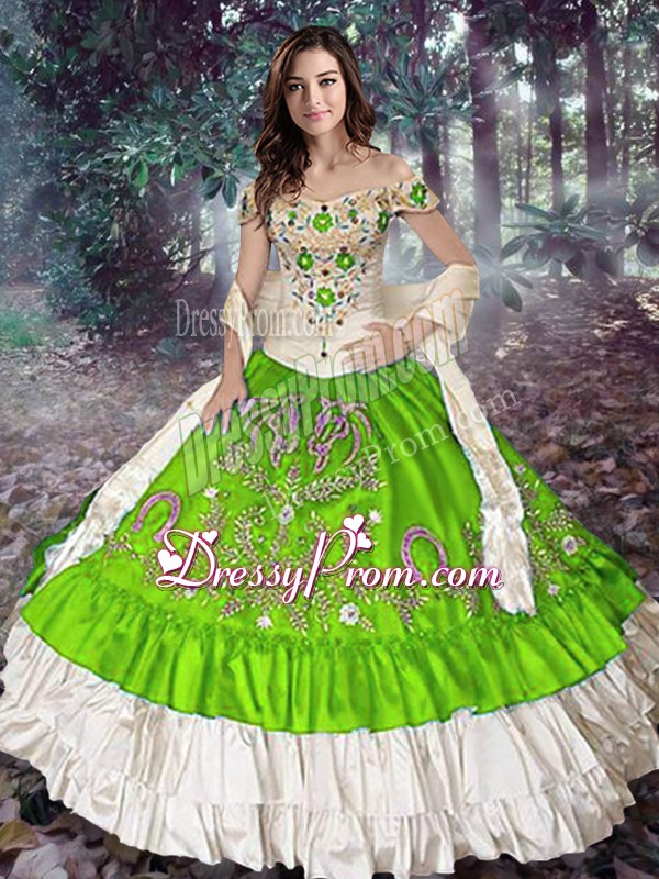 Neckline : Off the shoulder Shown Color : Spring Green Silhouette : Ball Gowns Sleeve Length : sleeveless Hemline : floor length Back Detail : Lace up Fabric : Taffeta Embellishment : Embroidery,Ruffled Layers Occasion : Military Ball,Sweet 16,Quinceanera Season : Spring,Summer,Fall,Winter