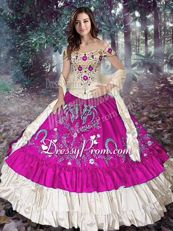 Neckline : Off the shoulderShown Color : FuchsiaSilhouette : Ball GownsSleeve Length : sleevelessHemline : floor lengthBack Detail : Lace upFabric : TaffetaEmbellishment : Embroidery,Ruffled LayersOccasion : Military Ball,Sweet 16,QuinceaneraSeason : Spring,Summer,Fall,Winter