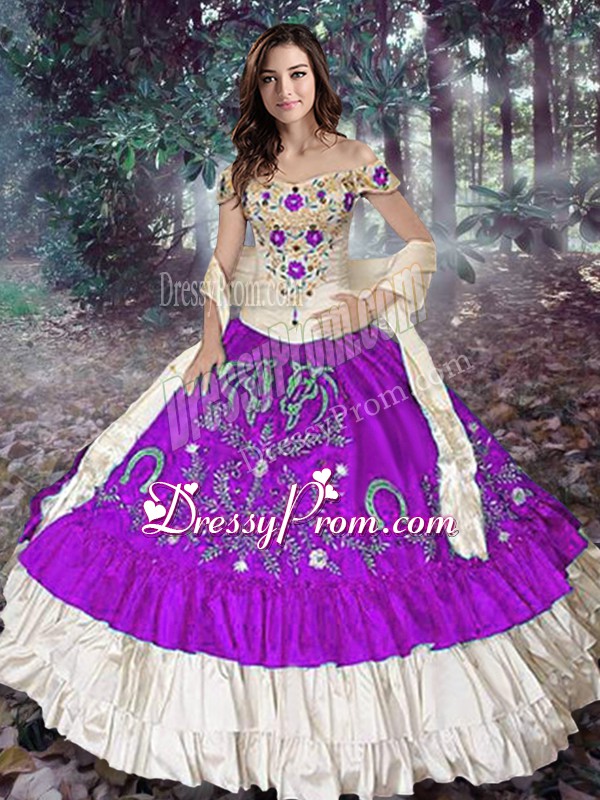 Neckline : Off the shoulderShown Color : Eggplant PurpleSilhouette : Ball GownsSleeve Length : sleevelessHemline : floor lengthBack Detail : Lace upFabric : TaffetaEmbellishment : Embroidery,Ruffled LayersOccasion : Military Ball,Sweet 16,QuinceaneraSeason : Spring,Summer,Fall,Winter