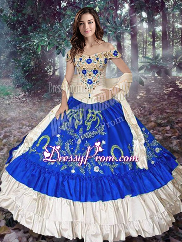 Neckline : Off the shoulder Shown Color : Royal Blue Silhouette : Ball Gowns Sleeve Length : sleeveless Hemline : floor length Back Detail : Lace up Fabric : Taffeta Embellishment : Embroidery,Ruffled Layers Occasion : Military Ball,Sweet 16,Quinceanera Season : Spring,Summer,Fall,Winter