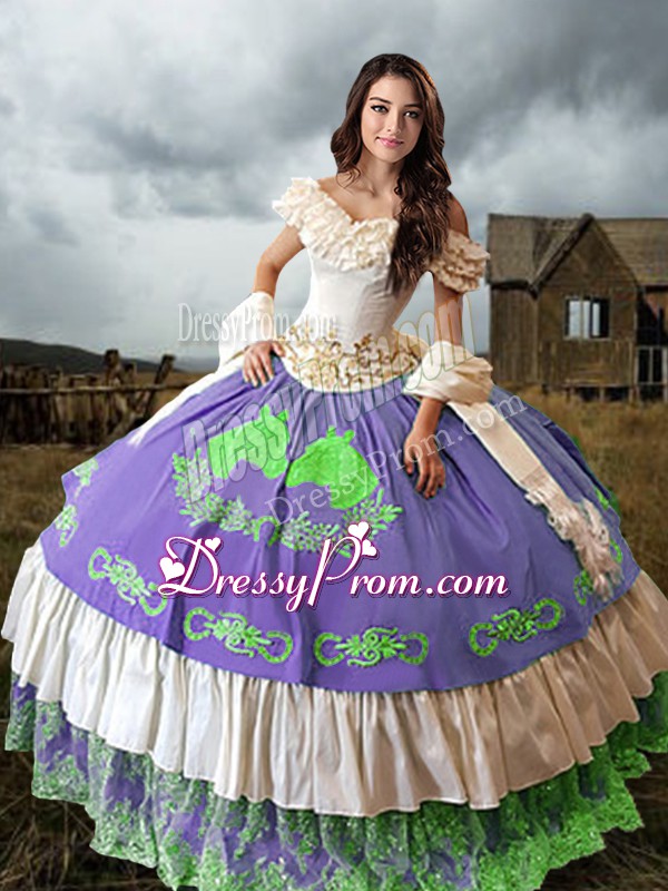 Sleeveless Taffeta Brush Train Lace Up Quinceanera Dresses in Multi-color with Embroidery and Ruffled Layers