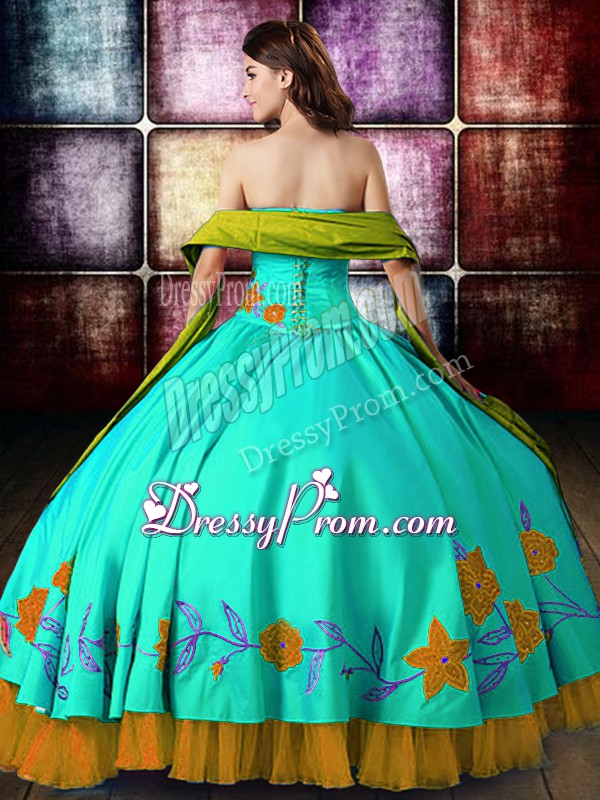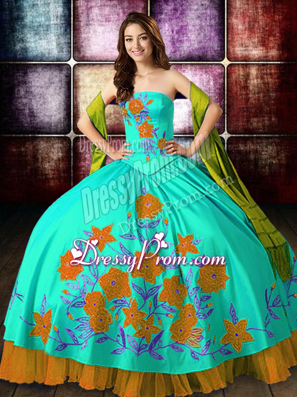 Neckline : StraplessShown Color : Multi-colorSilhouette : Ball GownsSleeve Length : sleevelessHemline : floor lengthBack Detail : Lace upFabric : SatinEmbellishment : EmbroideryOccasion : Military Ball,Sweet 16,QuinceaneraSeason : Spring,Summer,Fall,Winter