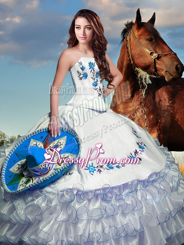 Sleeveless Floor Length Embroidery and Ruffled Layers Lace Up Sweet 16 Quinceanera Dress with White
