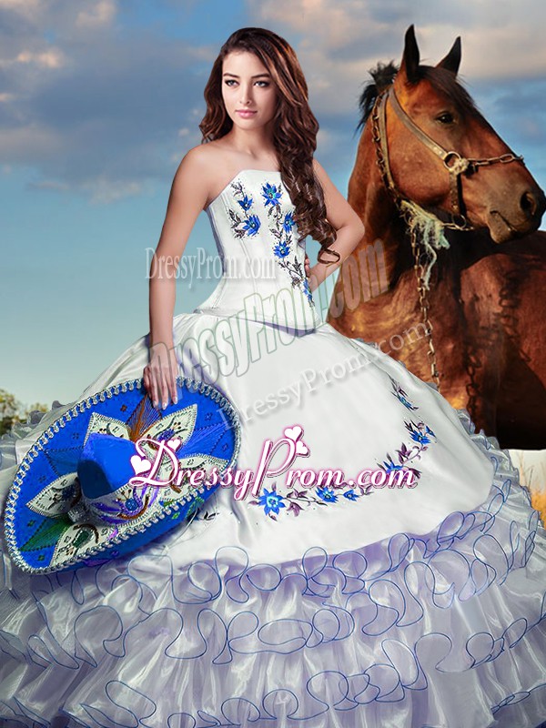 Neckline : StraplessShown Color : WhiteSilhouette : Ball GownsSleeve Length : long sleevesHemline : floor lengthBack Detail : Lace upFabric : TaffetaEmbellishment : Embroidery,Ruffled LayersOccasion : Military Ball,Sweet 16,QuinceaneraSeason : Spring,Summer,Fall,Winter