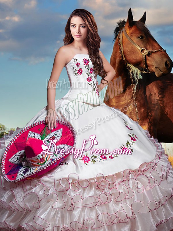 Neckline : StraplessShown Color : WhiteSilhouette : Ball GownsSleeve Length : sleevelessHemline : floor lengthBack Detail : Lace upFabric : TaffetaEmbellishment : Embroidery,Ruffled LayersOccasion : Military Ball,Sweet 16,QuinceaneraSeason : Spring,Summer,Fall,Winter
