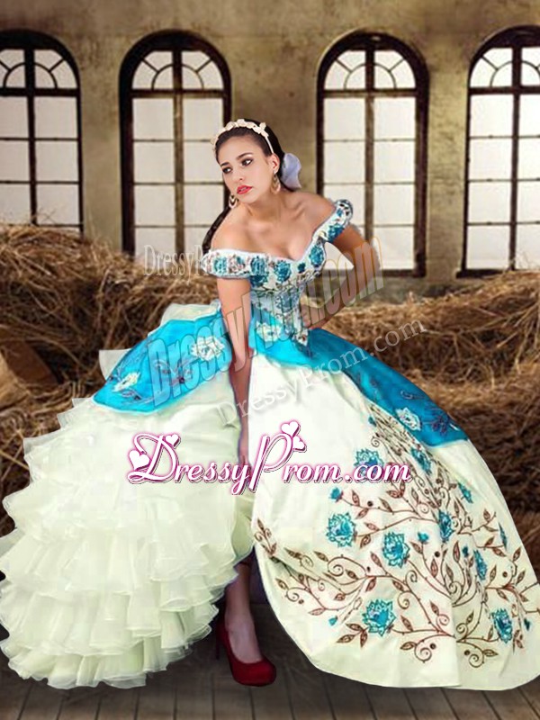 Multi-color Ball Gowns Taffeta Off The Shoulder Sleeveless Embroidery and Ruffled Layers Floor Length Lace Up Sweet 16 Quinceanera Dress