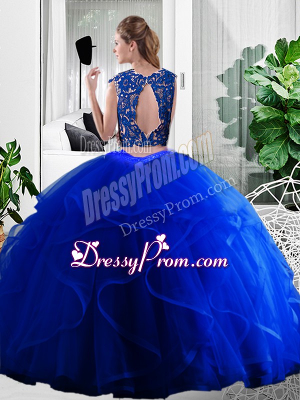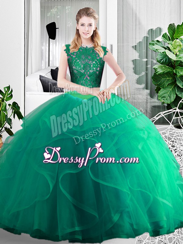 Neckline : ScoopShown Color : TurquoiseSilhouette : Two PiecesSleeve Length : sleevelessHemline : floor lengthBack Detail : ZipperFabric : TulleEmbellishment : Lace,RufflesOccasion : Military Ball,Sweet 16,QuinceaneraSeason : Spring,Summer,Fall,Winter