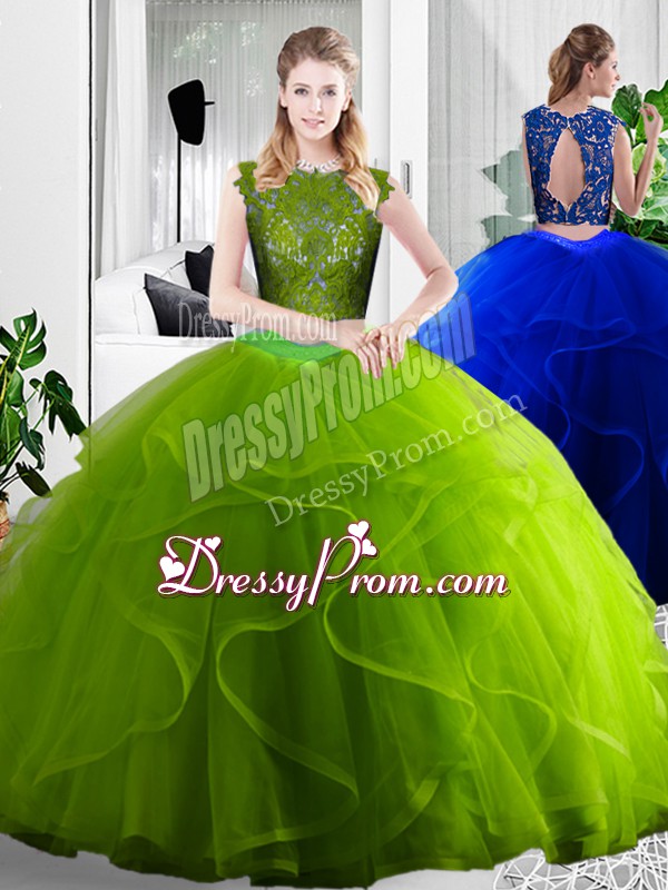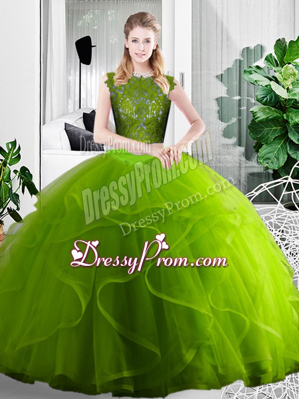 Neckline : ScoopShown Color : Olive GreenSilhouette : Two PiecesSleeve Length : sleevelessHemline : floor lengthBack Detail : ZipperFabric : TulleEmbellishment : Lace,RufflesOccasion : Military Ball,Sweet 16,QuinceaneraSeason : Spring,Summer,Fall,Winter