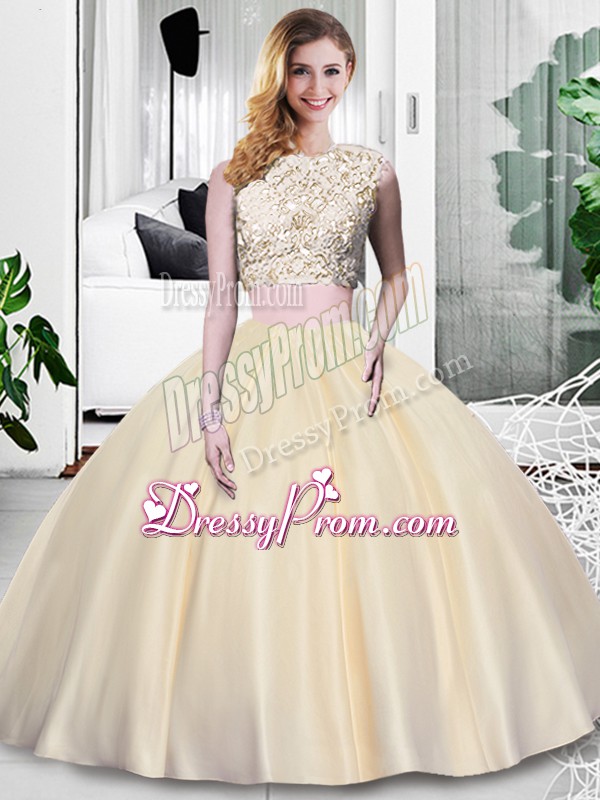 Neckline : ScoopShown Color : ChampagneSilhouette : Two PiecesSleeve Length : sleevelessHemline : floor lengthBack Detail : ZipperFabric : TaffetaEmbellishment : Lace,Appliques,RuchingOccasion : Military Ball,Sweet 16,QuinceaneraSeason : Spring,Summer,Fall,Winter