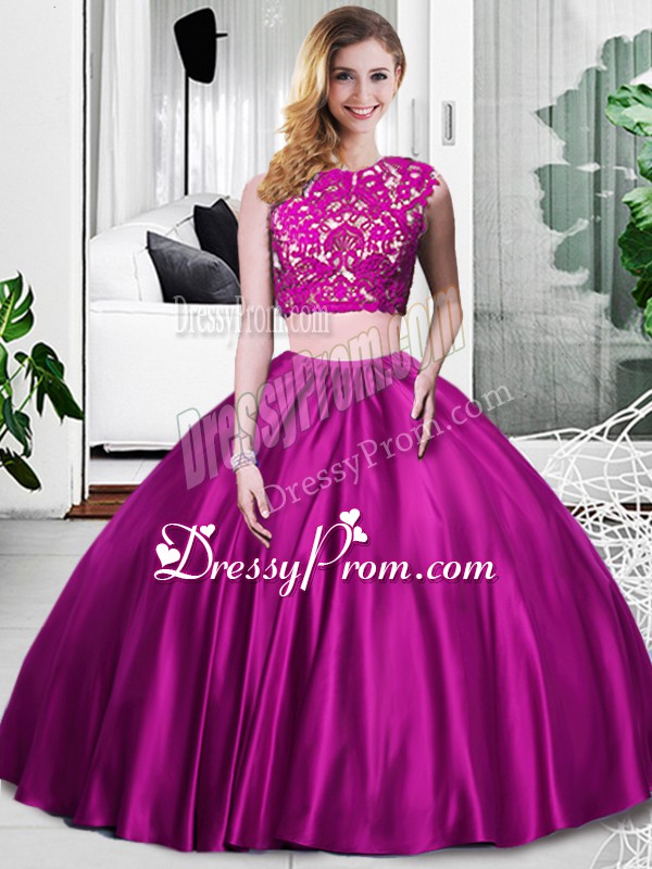 Neckline : ScoopShown Color : FuchsiaSilhouette : Two PiecesSleeve Length : sleevelessHemline : floor lengthBack Detail : ZipperFabric : TaffetaEmbellishment : Lace,RuchingOccasion : Military Ball,Sweet 16,QuinceaneraSeason : Spring,Summer,Fall,Winter
