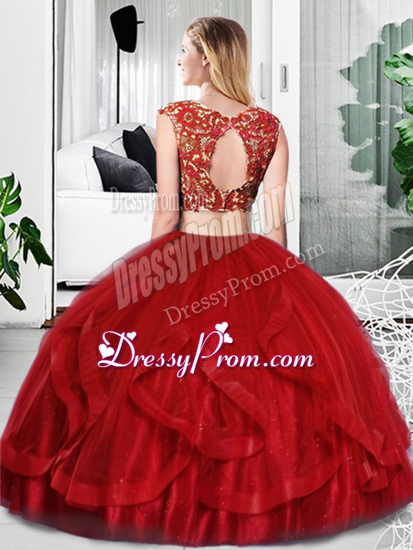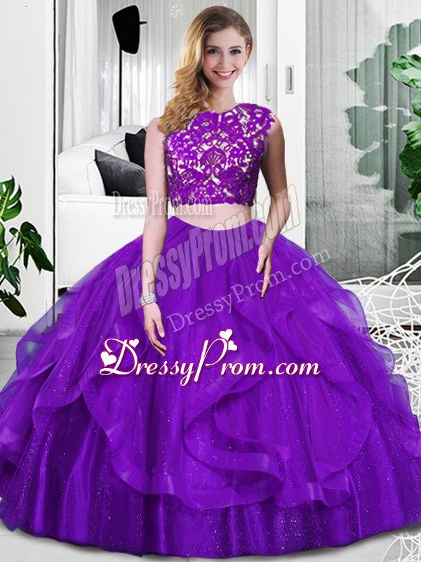 Neckline : ScoopShown Color : PurpleSilhouette : Two PiecesSleeve Length : sleevelessHemline : floor lengthBack Detail : ZipperFabric : TulleEmbellishment : Lace,RufflesOccasion : Military Ball,Sweet 16,QuinceaneraSeason : Spring,Summer,Fall,Winter