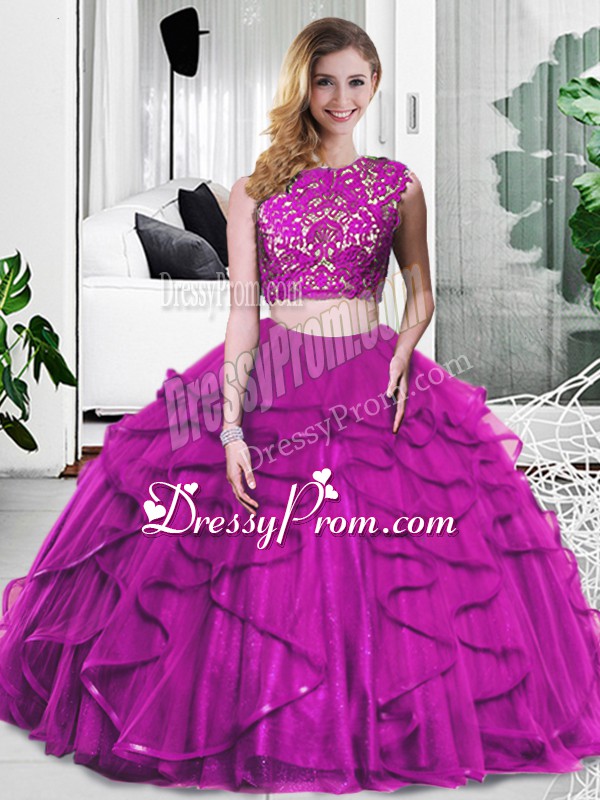 Neckline : ScoopShown Color : FuchsiaSilhouette : Two PiecesSleeve Length : sleevelessHemline : floor lengthBack Detail : ZipperFabric : TulleEmbellishment : Lace,RufflesOccasion : Military Ball,Sweet 16,QuinceaneraSeason : Spring,Summer,Fall,Winter