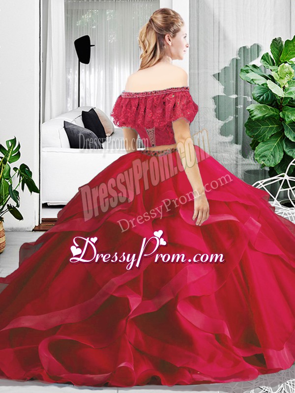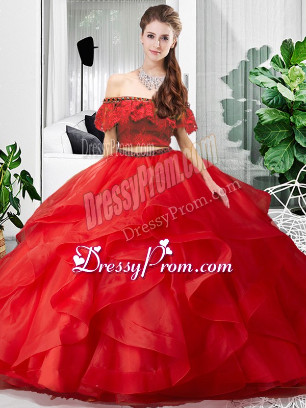 Neckline : Off the shoulder Shown Color : Red Silhouette : Two Pieces Sleeve Length : sleeveless Hemline : floor length Back Detail : Lace up Fabric : Tulle Embellishment : Lace,Ruffles Occasion : Military Ball,Sweet 16,Quinceanera Season : Spring,Summer,Fall,Winter