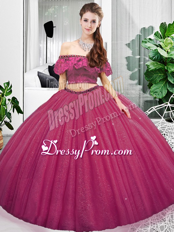 Neckline : Off the shoulder Shown Color : Fuchsia Silhouette : Two Pieces Sleeve Length : sleeveless Hemline : floor length Back Detail : Lace up Fabric : Organza Embellishment : Lace,Ruching Occasion : Military Ball,Sweet 16,Quinceanera Season : Spring,Summer,Fall,Winter