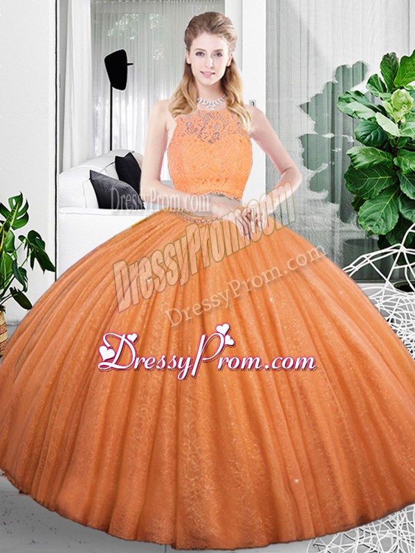 Neckline : ScoopShown Color : OrangeSilhouette : Two PiecesSleeve Length : sleevelessHemline : floor lengthBack Detail : ZipperFabric : OrganzaEmbellishment : Lace,RuchingOccasion : Military Ball,Sweet 16,QuinceaneraSeason : Spring,Summer,Fall,Winter