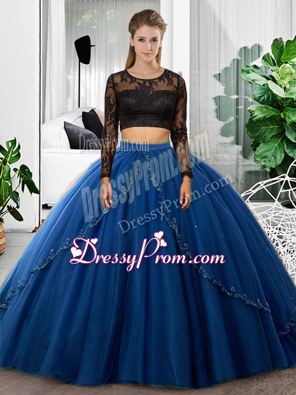 Neckline : ScoopShown Color : BlueSilhouette : Two PiecesSleeve Length : long sleevesHemline : floor lengthBack Detail : BacklessFabric : TulleEmbellishment : Lace,RuchingOccasion : Military Ball,Sweet 16,QuinceaneraSeason : Spring,Summer,Fall,Winter
