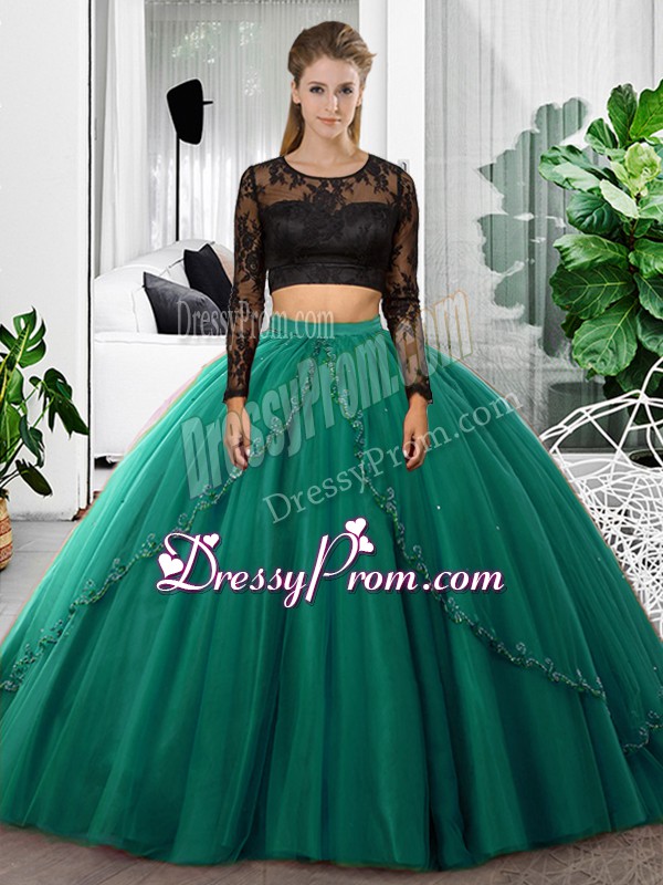 Neckline : Scoop Shown Color : Dark Green Silhouette : Two Pieces Sleeve Length : long sleeves Hemline : floor length Back Detail : Backless Fabric : Tulle Embellishment : Lace,Ruching Occasion : Military Ball,Sweet 16,Quinceanera Season : Spring,Summer,Fall,Winter