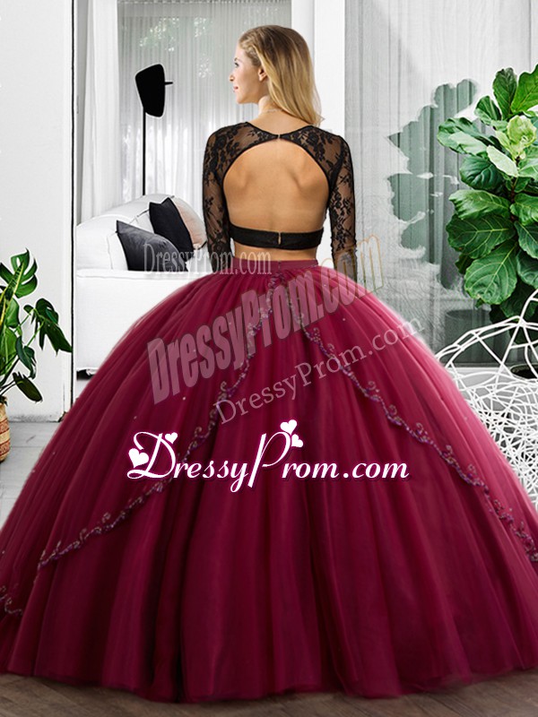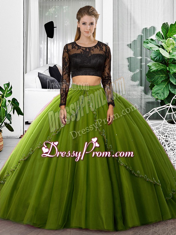 Neckline : ScoopShown Color : Olive GreenSilhouette : Two PiecesSleeve Length : long sleevesHemline : floor lengthBack Detail : BacklessFabric : TulleEmbellishment : Lace,RuchingOccasion : Military Ball,Sweet 16,QuinceaneraSeason : Spring,Summer,Fall,Winter