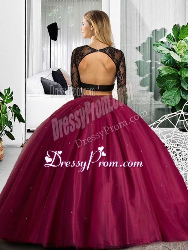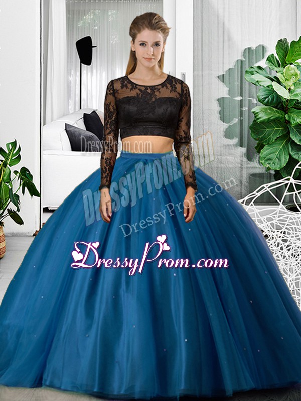 Neckline : ScoopShown Color : BlueSilhouette : Two PiecesSleeve Length : long sleevesHemline : floor lengthBack Detail : BacklessFabric : TulleEmbellishment : Lace,RuchingOccasion : Military Ball,Sweet 16,QuinceaneraSeason : Spring,Summer,Fall,Winter