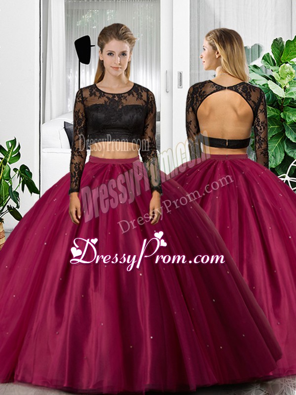 Neckline : ScoopShown Color : FuchsiaSilhouette : Two PiecesSleeve Length : long sleevesHemline : floor lengthBack Detail : BacklessFabric : TulleEmbellishment : Lace,RuchingOccasion : Military Ball,Sweet 16,QuinceaneraSeason : Spring,Summer,Fall,Winter