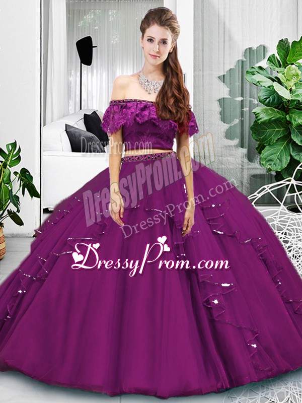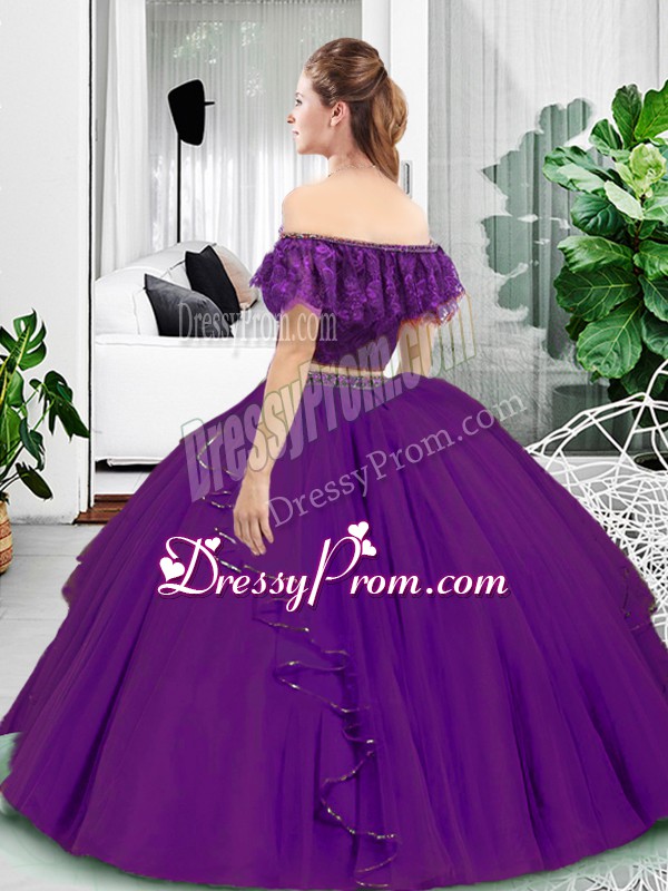 Neckline : Off the shoulderShown Color : Eggplant PurpleSilhouette : Two PiecesSleeve Length : sleevelessHemline : floor lengthBack Detail : Lace upFabric : TulleEmbellishment : Lace,RufflesOccasion : Military Ball,Sweet 16,QuinceaneraSeason : Spring,Summer,Fall,Winter