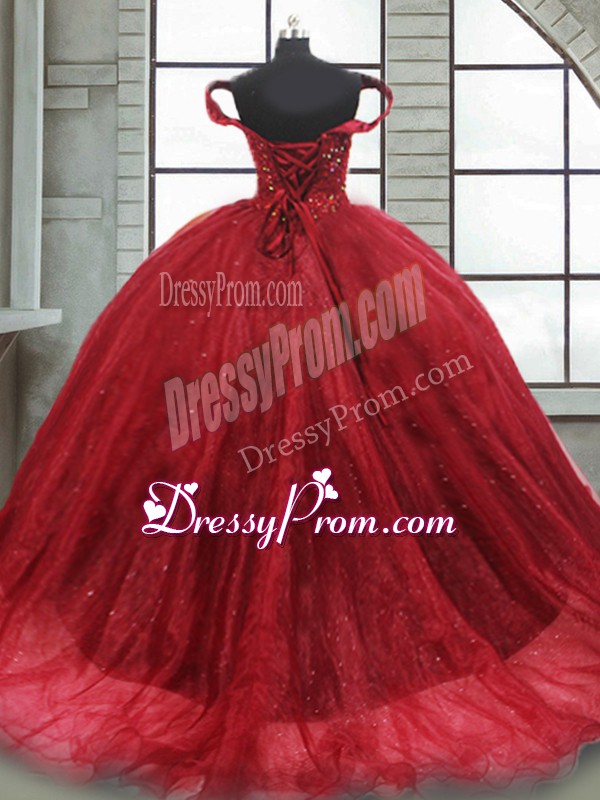 Neckline : Off the shoulderShown Color : Wine RedSilhouette : Ball GownsSleeve Length : sleevelessBack Detail : Lace upFabric : TulleEmbellishment : BeadingOccasion : Military Ball,Sweet 16,QuinceaneraSeason : Spring,Summer,Fall,Winter