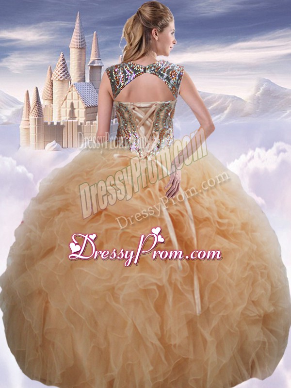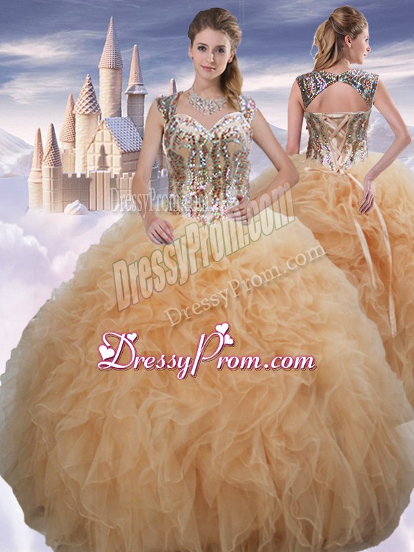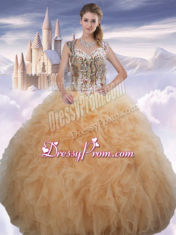 Neckline : SweetheartShown Color : ChampagneSilhouette : Ball GownsSleeve Length : sleevelessHemline : floor lengthBack Detail : Lace upFabric : OrganzaEmbellishment : Beading,RufflesOccasion : Military Ball,Sweet 16,QuinceaneraSeason : Spring,Summer,Fall,Winter
