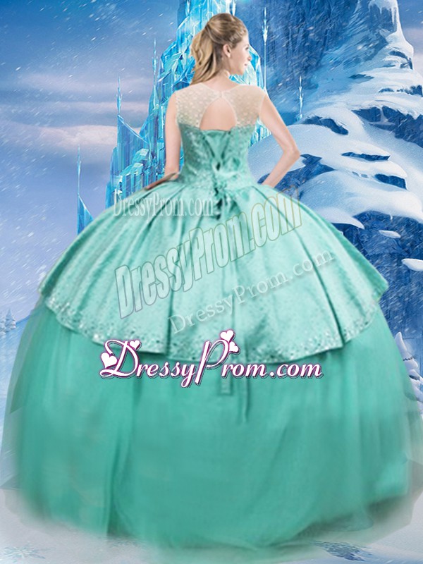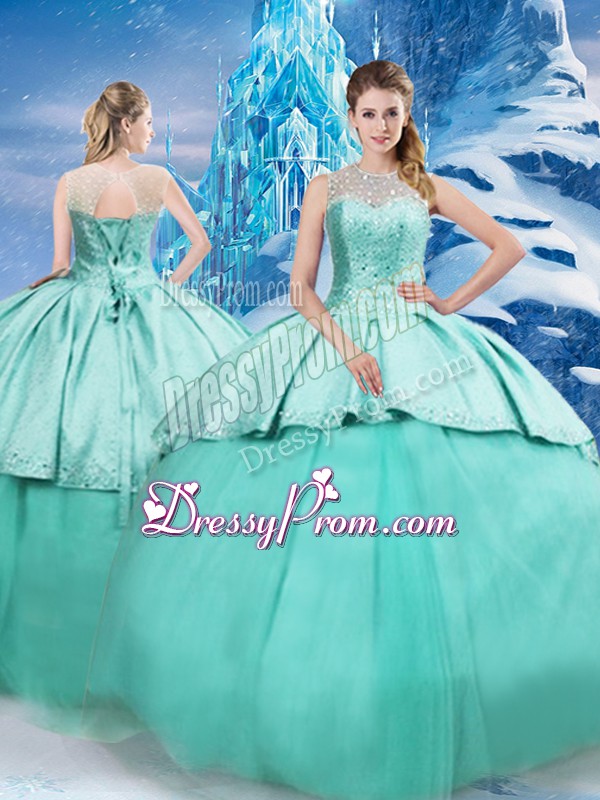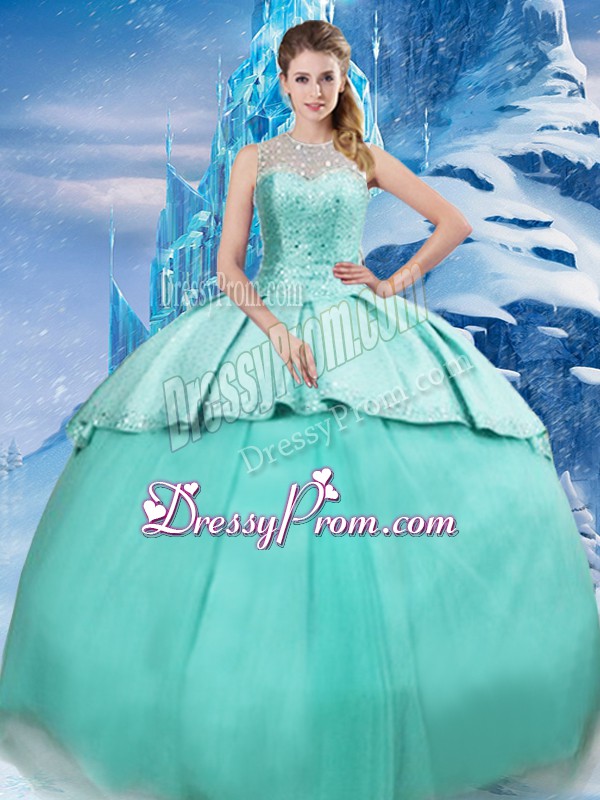 Neckline : ScoopShown Color : TurquoiseSilhouette : Ball GownsSleeve Length : sleevelessBack Detail : Lace upFabric : TulleEmbellishment : Beading,RuchingOccasion : Military Ball,Sweet 16,QuinceaneraSeason : Spring,Summer,Fall,Winter