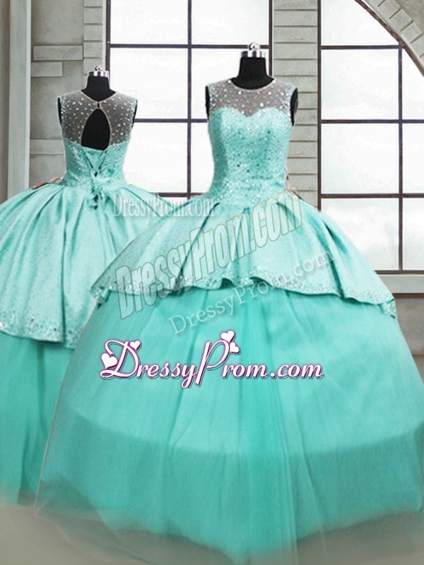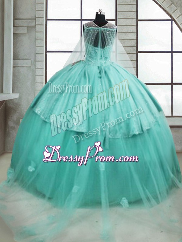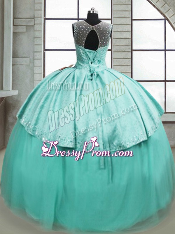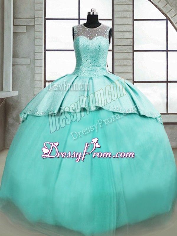 Neckline : ScoopShown Color : TurquoiseSilhouette : Ball GownsSleeve Length : sleevelessBack Detail : Lace upFabric : TulleEmbellishment : BeadingOccasion : Military Ball,Sweet 16,QuinceaneraSeason : Spring,Summer,Fall,Winter