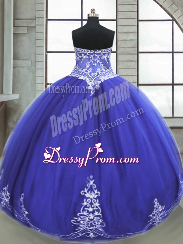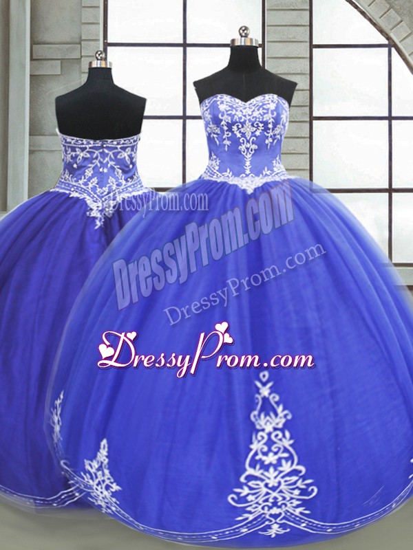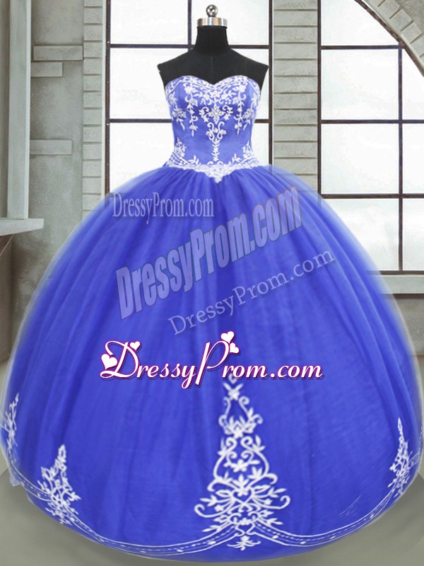 Neckline : SweetheartShown Color : BlueSilhouette : Ball GownsSleeve Length : sleevelessHemline : floor lengthBack Detail : Lace upFabric : TulleEmbellishment : AppliquesOccasion : Military Ball,Sweet 16,QuinceaneraSeason : Spring,Summer,Fall,Winter