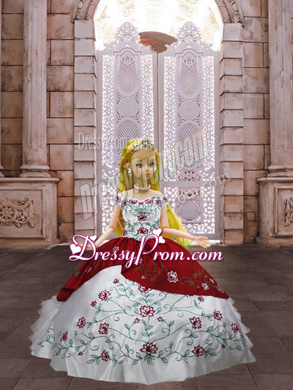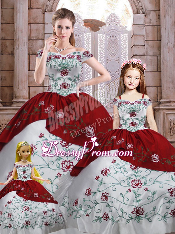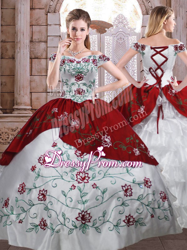 Neckline : Off the shoulder Shown Color : White And Red Silhouette : Ball Gowns Sleeve Length : sleeveless Hemline : floor length Back Detail : Lace up Fabric : Taffeta Embellishment : Embroidery Occasion : Military Ball,Sweet 16,Quinceanera Season : Spring,Summer,Fall,Winter