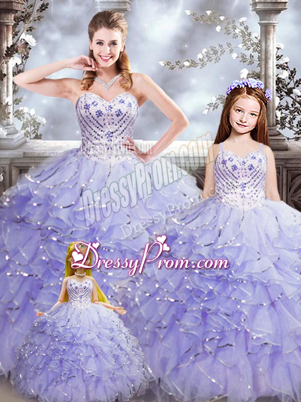 Captivating Lavender Ball Gowns Sweetheart Sleeveless Organza Floor Length Lace Up Beading and Ruffles Quinceanera Dresses