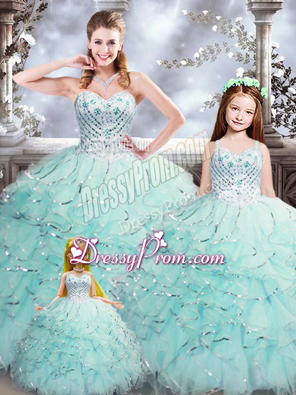 Romantic Aqua Blue Organza Lace Up Sweetheart Sleeveless Floor Length Quinceanera Gowns Beading and Ruffles