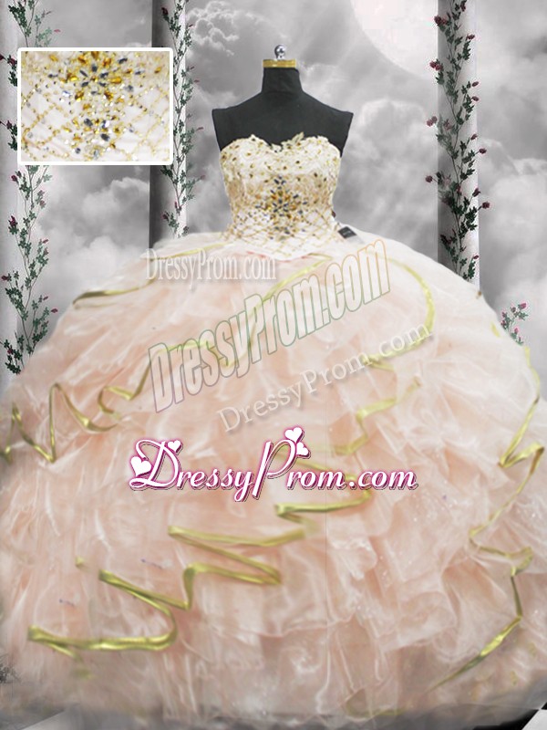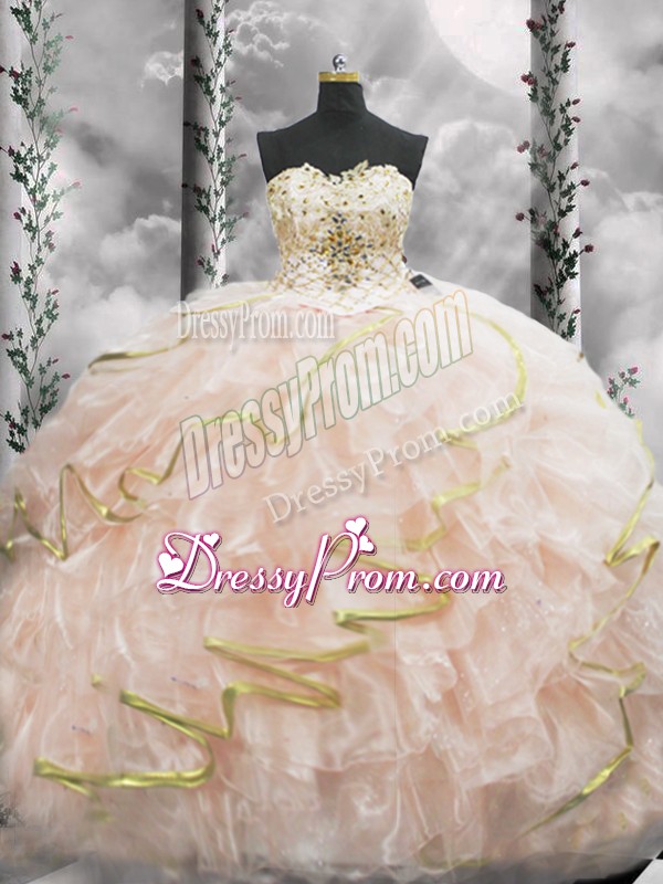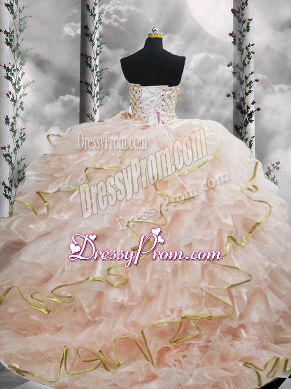 Super Peach Sleeveless Organza Brush Train Lace Up 15th Birthday Dress for Military Ball and Sweet 16 and Quinceanera