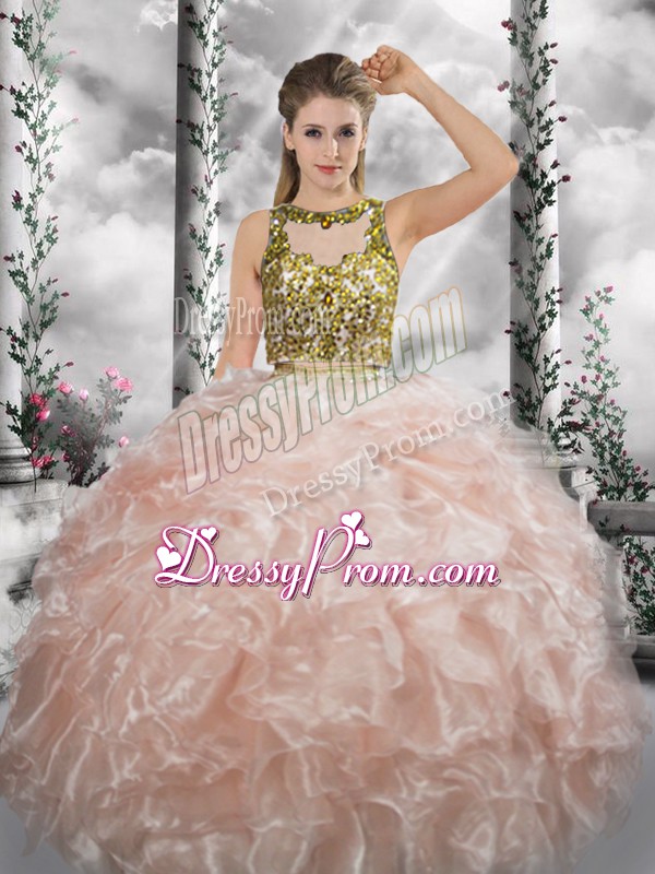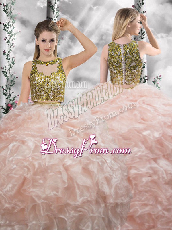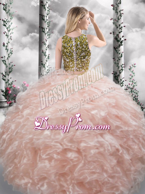 Neckline : ScoopShown Color : PeachSilhouette : Two PiecesSleeve Length : sleevelessHemline : floor lengthBack Detail : ZipperFabric : OrganzaEmbellishment : Beading,RufflesOccasion : Military Ball,Sweet 16,QuinceaneraSeason : Spring,Summer,Fall,Winter