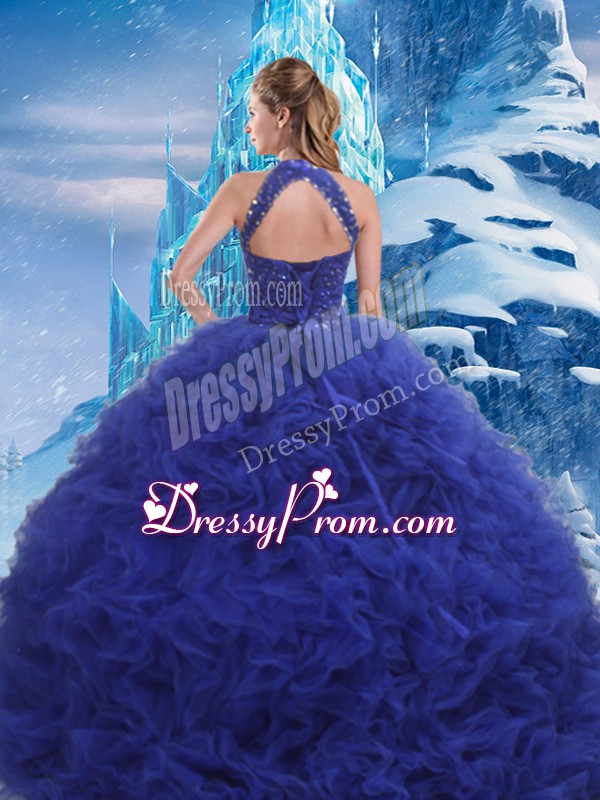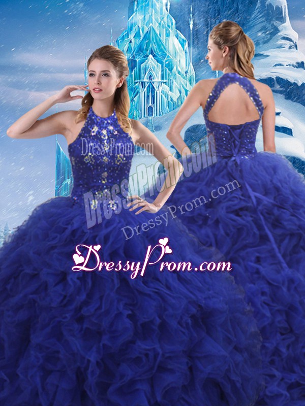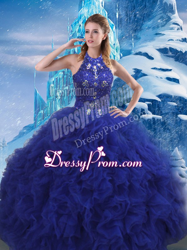 Neckline : ScoopShown Color : BlueSilhouette : Ball GownsSleeve Length : sleevelessBack Detail : Lace upFabric : OrganzaEmbellishment : Beading,RufflesOccasion : Military Ball,Sweet 16,QuinceaneraSeason : Spring,Summer,Fall,Winter