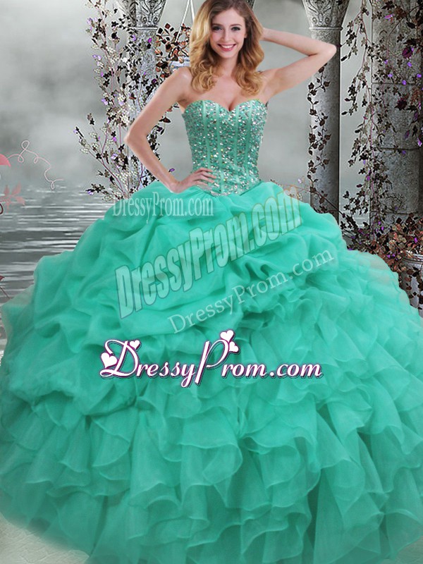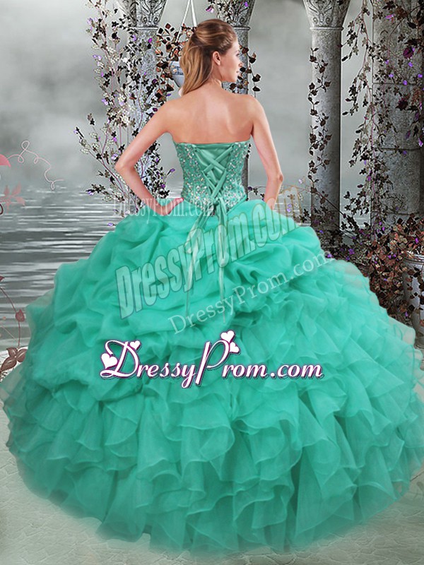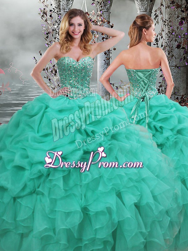 Neckline : SweetheartShown Color : TurquoiseSilhouette : Ball GownsSleeve Length : sleevelessHemline : floor lengthBack Detail : Lace upFabric : OrganzaEmbellishment : Beading,RufflesOccasion : Military Ball,Sweet 16,QuinceaneraSeason : Spring,Summer,Fall,Winter