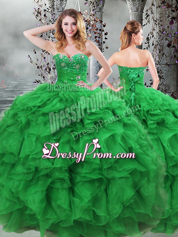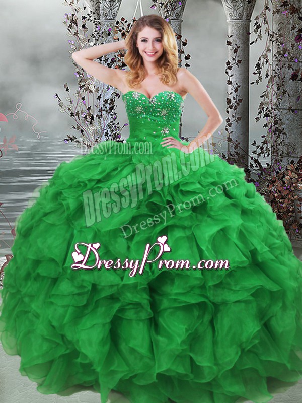 Flare Green Ball Gowns Organza Sweetheart Sleeveless Beading and Ruffles Floor Length Lace Up Vestidos de Quinceanera