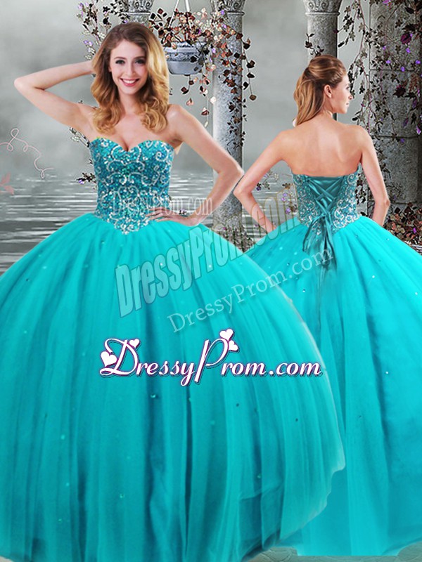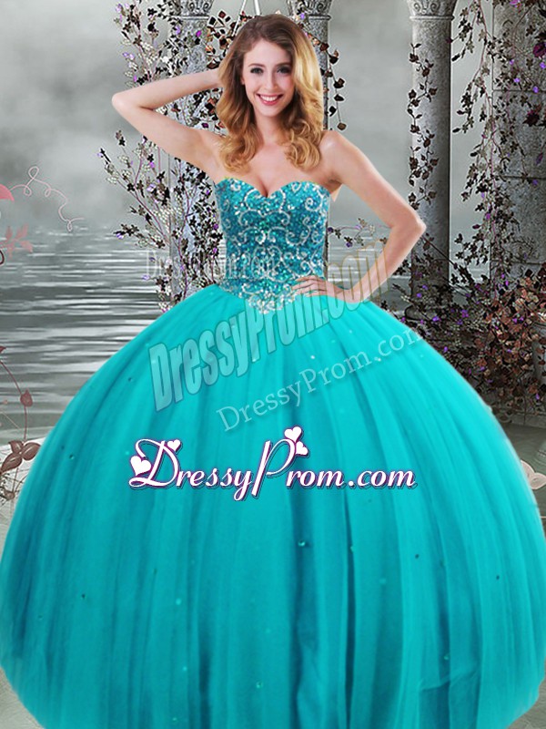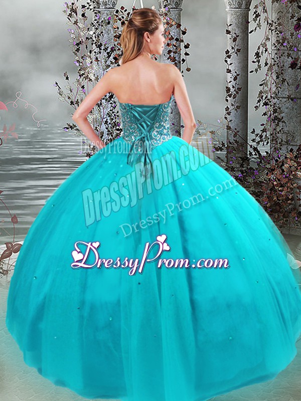 Neckline : SweetheartShown Color : Aqua BlueSilhouette : Ball GownsSleeve Length : sleevelessHemline : floor lengthBack Detail : Lace upFabric : TulleEmbellishment : BeadingOccasion : Military Ball,Sweet 16,QuinceaneraSeason : Spring,Summer,Fall,Winter