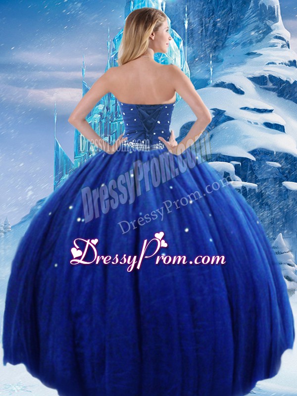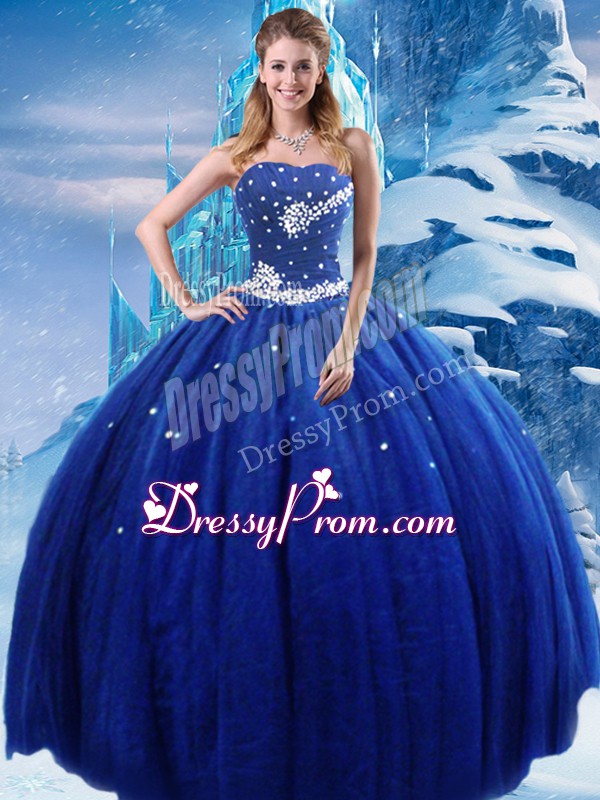 Neckline : StraplessShown Color : Royal BlueSilhouette : Ball GownsSleeve Length : sleevelessHemline : floor lengthBack Detail : Lace upFabric : TulleEmbellishment : BeadingOccasion : Military Ball,Sweet 16,QuinceaneraSeason : Spring,Summer,Fall,Winter