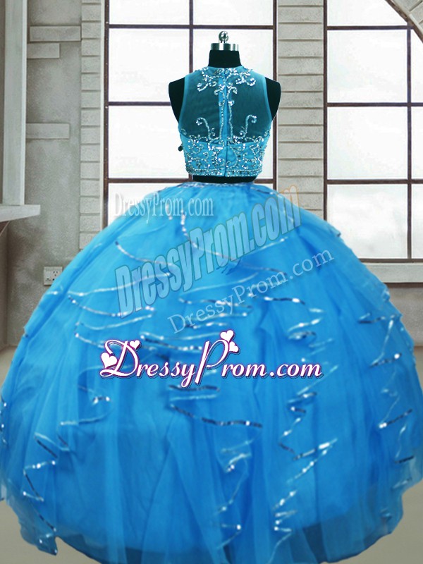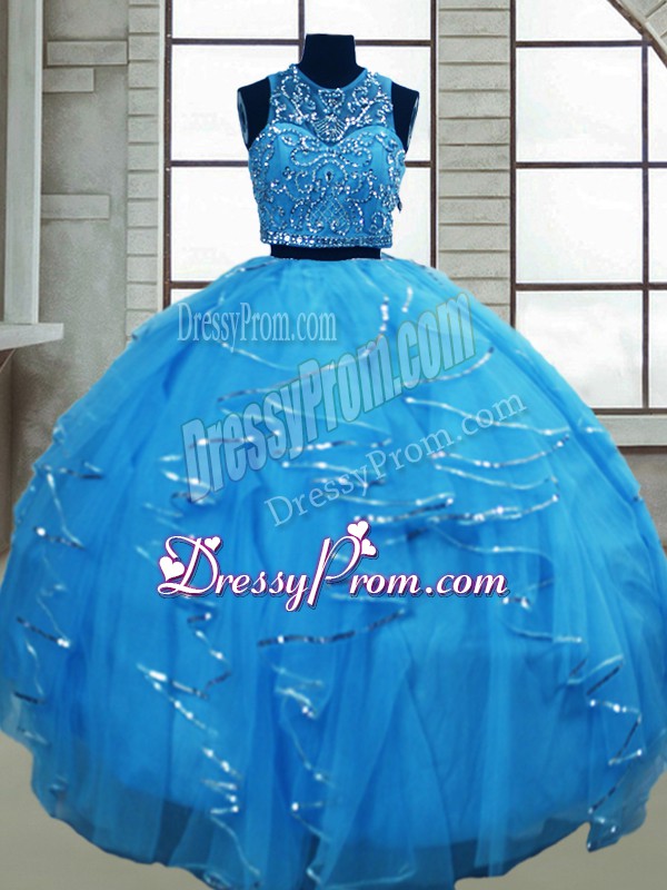 Neckline : ScoopShown Color : Baby BlueSilhouette : Two PiecesSleeve Length : sleevelessHemline : floor lengthBack Detail : Lace upFabric : TulleEmbellishment : Beading,RufflesOccasion : Military Ball,Sweet 16,QuinceaneraSeason : Spring,Summer,Fall,Winter