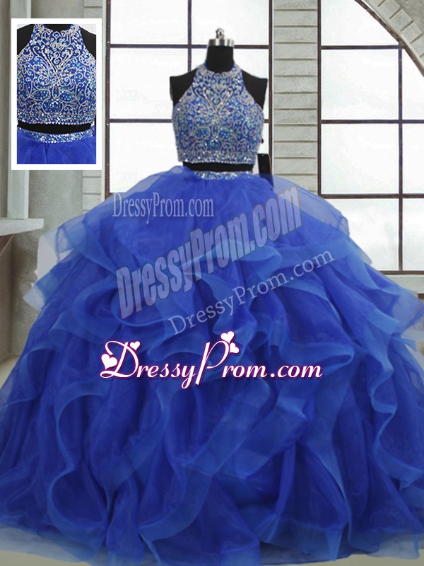 Exceptional Royal Blue Ball Gowns Halter Top Sleeveless Organza Floor Length Lace Up Beading and Ruffles 15th Birthday Dress